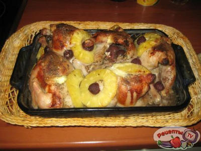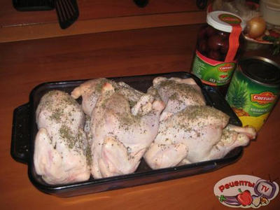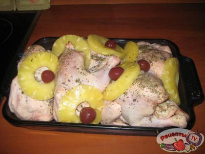 Обкладываем тушки ананасами, вишней, поливаем соком из банки и ставим в духовку на 1 час.