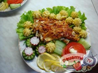 3 крупных карася, 3 средние луковицы, 350г шампиньонов,300 г сметаны, 5 зубчиков чеснока