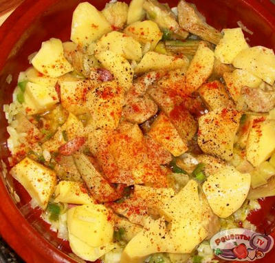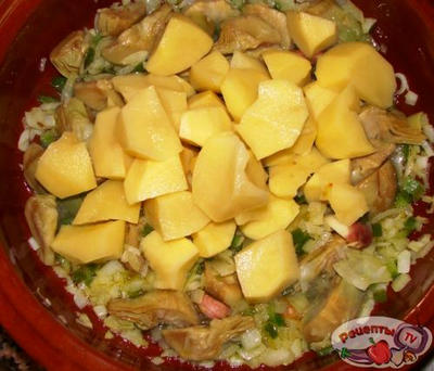 добавить артишоки и картофель нарезаный кубиками,всё это слегка поджарить...