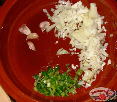 лук и зелёный перец мелко нарезать и вместе с неочищенным чесноком обжарить на оливк.масле 3 мин...