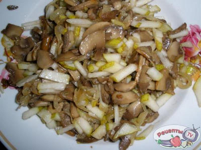 Лучок обжариваем до прозрачности, присоединяем грибы, тушим 10 минут. Остужаем. Добавляем грушу, все хорошо перемешиваем.