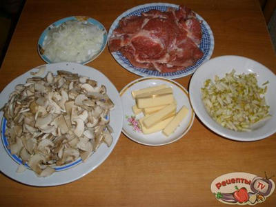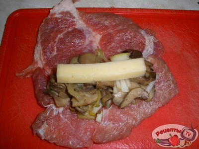 Мяско нарезаем на продолговатые ломтики, отбиваем, солим, перчим. Лук нарезаем полукольцами, грибы - пластинами, грушу - небольшими кусочками. Сыр нарезаем полосочками толщиной 0,5*0,5 см.