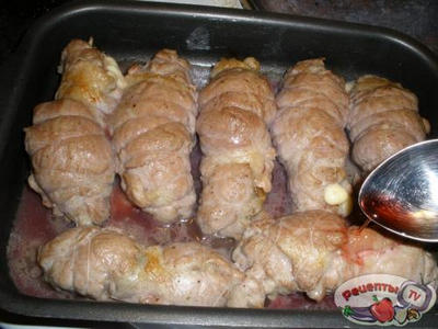На кусочек мяска выкладываем немного начинки, ломтик сыра и сворачиваем в рулетик, перематываем ниткой или можно сколоть зубочистками. Выкладываем на смазанный растит. маслом противень. Ставим в разогретую духовку до 180гр. на 10 минут. Далее каждый рулетик обливаем вином и опять отправляем в духовку до полной готовности примерно на 10-15 минут.