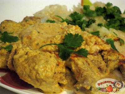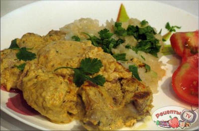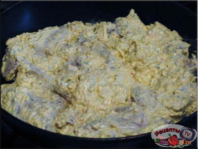 Разогреть 3 ст.л. масла, прибавить куски мяса вместе со всей творожной пастой и тушить на малом огне под крышкой 15 минут.