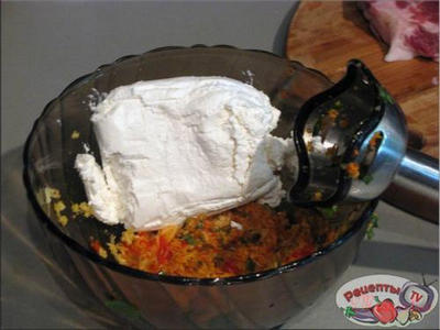 Помытые и почищенные чеснок,перец и имбирь натереть на мелкой терке. Добавить 25 гр кинзы, специи, соль и творог, и взбить погружным блендером до однородной смеси. Натереть мясо этой смесью и мариновать 1 час.