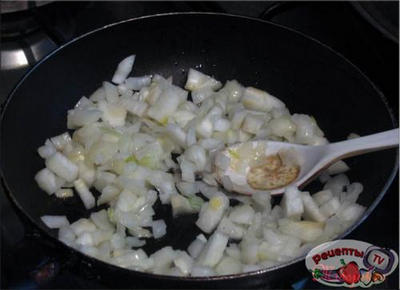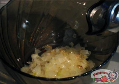 Очищенный лук порезать кубиками и обжарить на отдельной сковороде до золотисто-коричневого цвета, затем мелко смолоть.