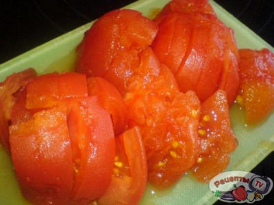 С помидор снять кожицу, предварительно ошпарив кипятком, крупно нарезать.