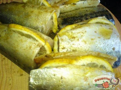 Скумбрию почистить, промыть, посолить, поперчить, сбрызнуть лимон.соком и нашпиговать полукольцами лимона (рыбку можно использовать как цельную, так и порезанную на кусочки).