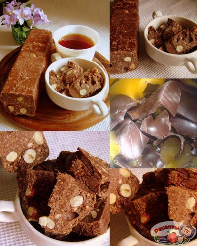 В шоко-массу добавить измельчённое печенье (можно в крошку, а можно и покрупнее), ореховую крошку, и цельные орехи фундук.