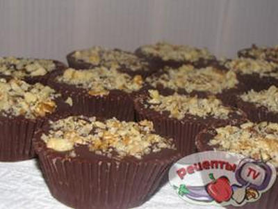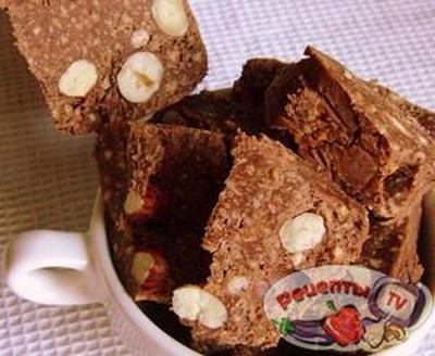 3 -й пласт бисквита ломаем на маленькие кусочки, обмакиваем в растопленный шоколад и равномерно распределяем на застывшее суфле.