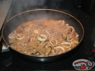 Разогреть сковороду,выложить морской коктейль, накрыть крышкой и готовить 2-3 минуты.
