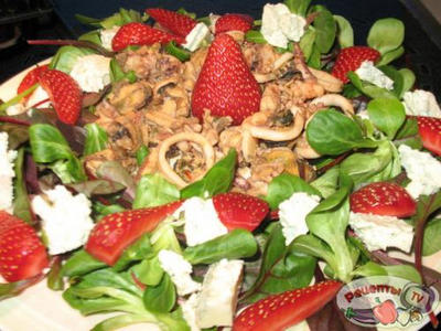Разложить листья салата по тарелке,сверху выложить морской коктейль, на листья салата выложить сыр и клубнику. Перед подачей полить соусом.