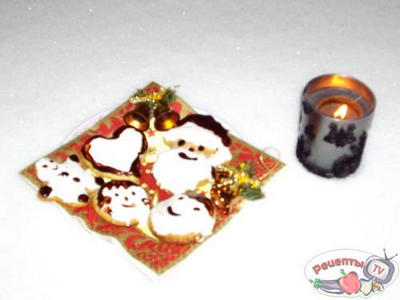 сначала белый цвет - взбивает белки трёх яиц и постепенно добавляем сахарную пудру - должна получиться вмеру густая глазурь, чтобы удобно было рисовать, затем отделяем часть глазури в другую посуду, добавляем какао - таки образом получается шоколадная глазурь. Наносим на остывшие печенья рисунки, разукрашиваем бороду николая, кафтанчик и варежки, сапожки, рисуем узорчики на сердечках, у меня ещё были круглые печеньки в белой глазури и коричневой глазурью на них нарисованы самйлики рисовала кисточкой для теней от Мэри Кей.... :-)