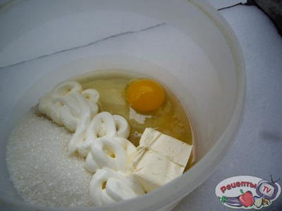 Замешиваем тесто: смешиваем яйцо, мёд, сахар, погашенную соду, маргарин (масло), муку, сметану, растительное масло до состояния однородной гладкой массы, формируем колобок и ставим на холод не менее чем на 1 час.