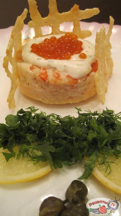 Почистить креветки , подсолить, добавить половину сока лайма, отставить . Лосось измельчить на блендере, добавить сливки, соль, сок лайма, перец, мускатный орех. Взять формочки, смазать маслом, присыпать мукой и покрутить ее в руках, так чтоб мука равномерно распределилась по форме, лишнюю муку стяхнуть( это для того, чтобы содержимое было легче достать).Взбиваем в тугую пену белки, аккуратно смешиваем с лососем. Выкладываем в каждую форму по 4 креветки и смесь. Ставим в духовку, выпекаем на паровой бане ,при температуре 180 градусов, примерно минут 35. Сыр режем тонкими полосками , выкладываем на пергаменте "решеткой",запекаем пока не подрумянится. Выкладываем на тарелку суфле, украшаем икрой, лимоном и сырными чипсами.
