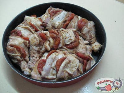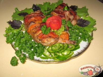 Я довольно таки редко готовлю блюда из окорочков, большее предбочтение отдаю мясу, домашней птице,рыбе. Но вот сегодня получилось так, что в холодильнике не оказалось мяса, на базар ехать не было времени,поэтому в соседнем магазинчике купила окорочка. Ужасно хотелось чего-нибудь перехватить(в смысле покушать). Но я всегда придерживаюсь такого принципа, что готовить нужно на голодный желудок. Для начала включила духовку на 200 гр.Вот тут и пошла в ход моя фантазия!Быстренько разморозила окорочка,Перемешала вишневый уксус с водой, добавила соли по своему вкусу.На окорочках сделала надрезы по 3 на каждом наискосок до косточки. Смазала горчицей собственного приготовления, посолила, поперчила черным перцем,молотым имбирем, тщательно промазав и сами разрезы. Затем в каждый надрез положила очень тоненький кусочек копченого бекона по размеру надреза(у нас на базаре продают необычайно вкусные копчености), затем курагу также по размеру надреза(курагу можно разъеденить на 2 части по своему усмотрению).Выкладываем окорочка на лист, добавляем вишневый маринадик, чтобы закрыть донышко, ставим в духовку, на 1 час, периодически поливаем окорочка маринадиком. Духовки все работают по разному, нужно , чтобы окорочка приобрели румянный цвет. В процессе приготовления я периодически переключала, то на макси-гриль, то на нагрев снизу. Самое главное, что блюдо получилось очень вкусное. При всем нашем отрицательном отношении к окорочкам! Разумеется украсила зеленью, которая растет у меня круглый год , поэтому присутствует всегда в больших количествах в моих блюдах и даже своими помидорчиками и перчиками.